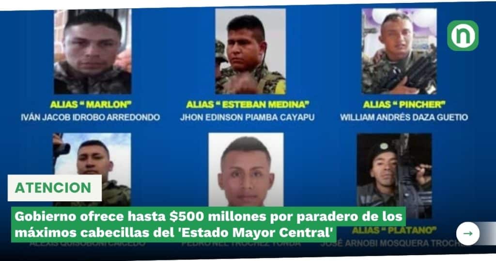 El Gobierno Nacional, bajo la presidencia de Gustavo Petro, anunció la noche de este lunes que ofrece hasta 500 millones de pesos por información que conduzca al paradero de los seis máximos cabecillas del ‘Estado Mayor Central’ de las disidencias de las Farc. Este grupo ilegal ha sido responsable de diversos ataques en el suroccidente del país.