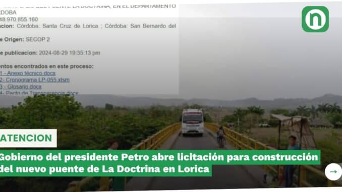El gobierno del presidente Gustavo Petro, a través del Ministerio de Transporte e Invías, ha abierto la licitación pública para la construcción del nuevo Puente de La Doctrina, ubicado sobre el río Sinú en Lorica. [ Leer más ]