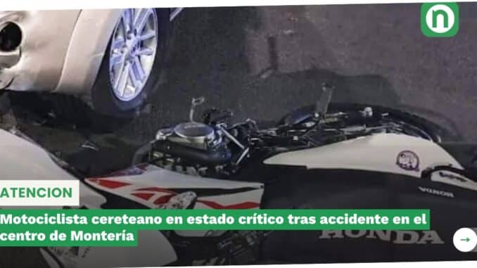 Motociclista cereteano en estado crítico tras accidente en el centro de Montería