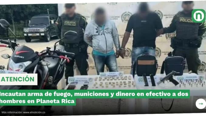 Incautan arma de fuego, municiones y dinero en efectivo a dos hombres en Planeta Rica