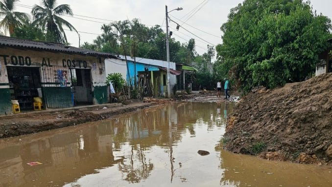 La calle La Esmeralda, en el corregimiento de Martínez, se encuentra sumergida después del aguacero que cayó en la tarde del domingo. Los residentes hacen un llamado a las autoridades competentes para atender la situación . .