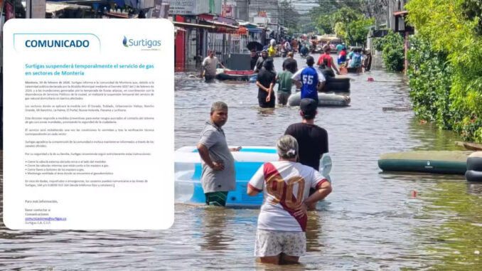 Surtigas suspende suministro de gas en diez barrios de Montería por riesgo asociado a inundaciones