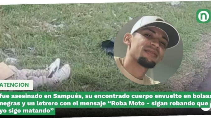 fue asesinado en Sampués, su encontrado cuerpo envuelto en bolsas negras y un letrero con el mensaje “Roba Moto – sigan robando que yo sigo matando”