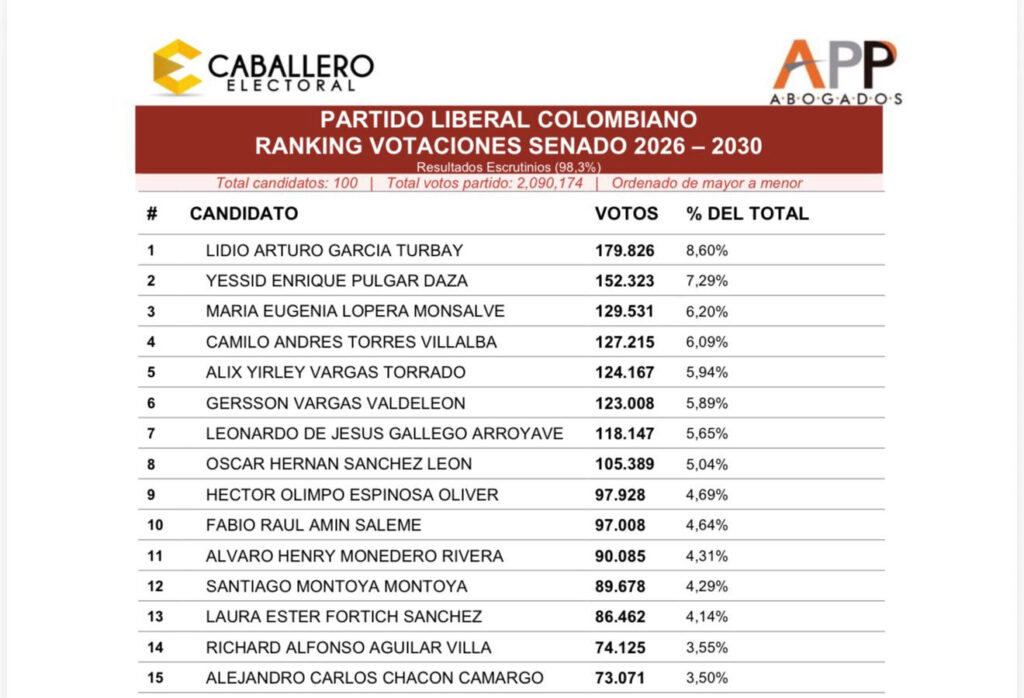Finalizados los escrutinios de las elecciones al Congreso de la República del pasado 8 de marzo, el dirigente liberal Camilo Torres Villalba se posicionó como la cuarta votación más alta del Partido Liberal en todo el país, alcanzando un total de 127.215 votos, de acuerdo con el ranking oficial de la colectividad.