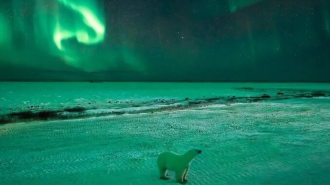 Imagen de oso polar bajo aurora boreal sorprende en redes sociales