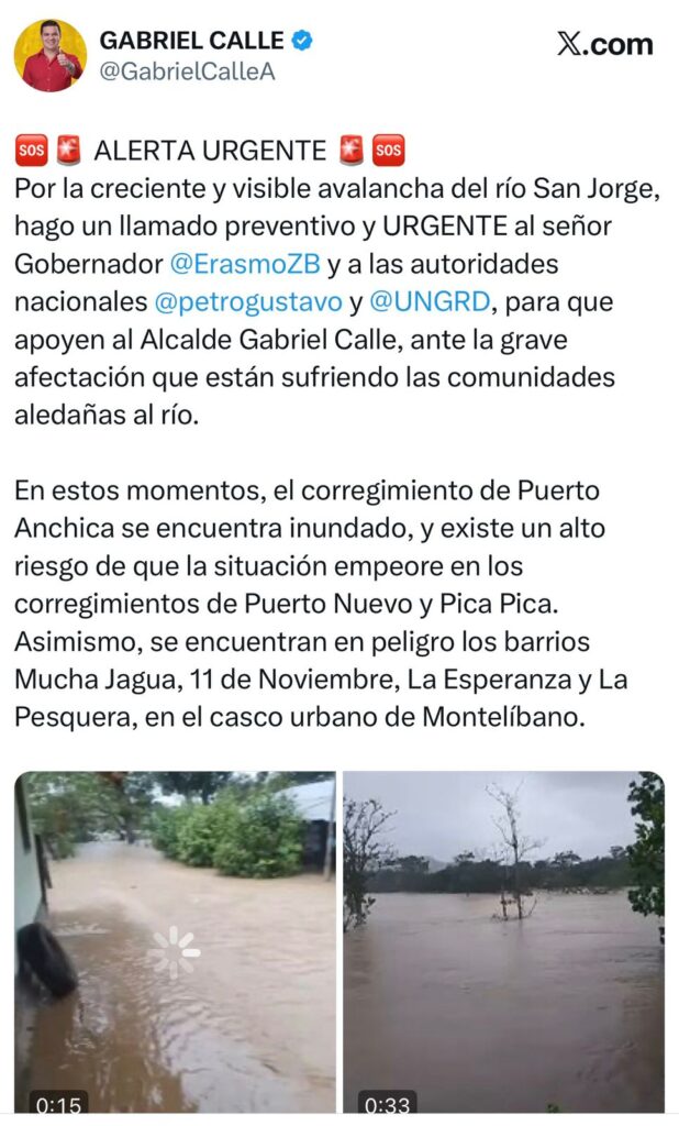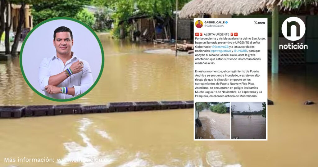 En un mensaje publicado en X, el líder del Movimiento Nuevo Futuro expresó: “Hago un llamado preventivo y URGENTE a las autoridades departamentales y nacionales para atender la grave afectación que están sufriendo las comunidades aledañas al río San Jorge”.