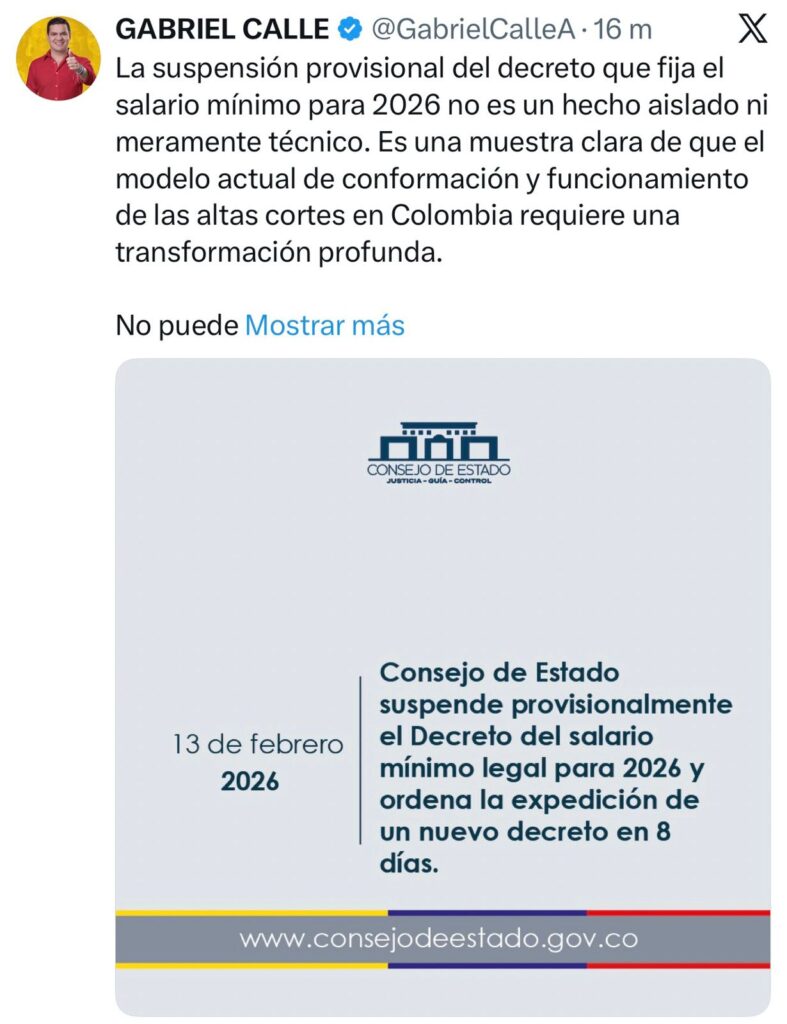 El diputado Gabriel Calle Aguas cuestionó con firmeza la suspensión provisional del decreto que fijó el salario mínimo para 2026, una norma que había establecido un aumento cercano al 23% para millones de trabajadores en Colombia.