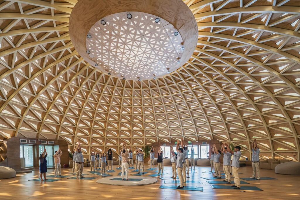 FLOW se caracteriza por una cúpula geodésica cuya geometría repetitiva configura una identidad simbólica orientada al bienestar emocional y espiritual. Su concepción reúne elementos de tecnología, diseño digital y estrategias de iluminación natural, generando un ambiente armónico que invita a la calma, la introspección y el equilibrio sensorial.