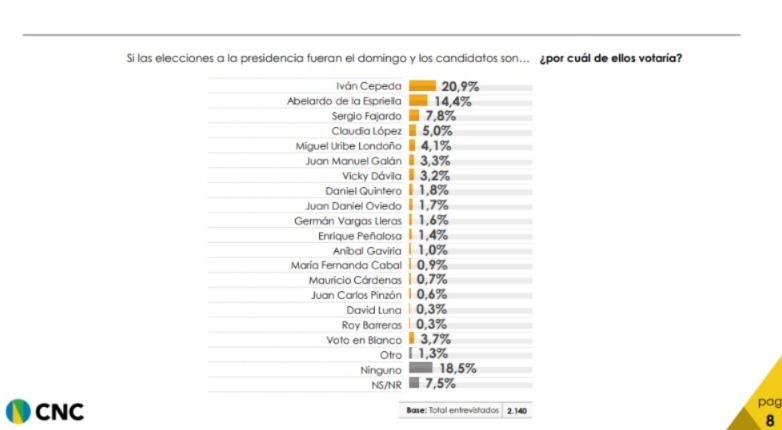 • Derecha: Abelardo de la Espriella (19,6%), Miguel Uribe Londoño (14,2%), Germán Vargas Lleras (13,3%), Vicky Dávila (10,5%) y Juan Carlos Pinzón (3,9%).