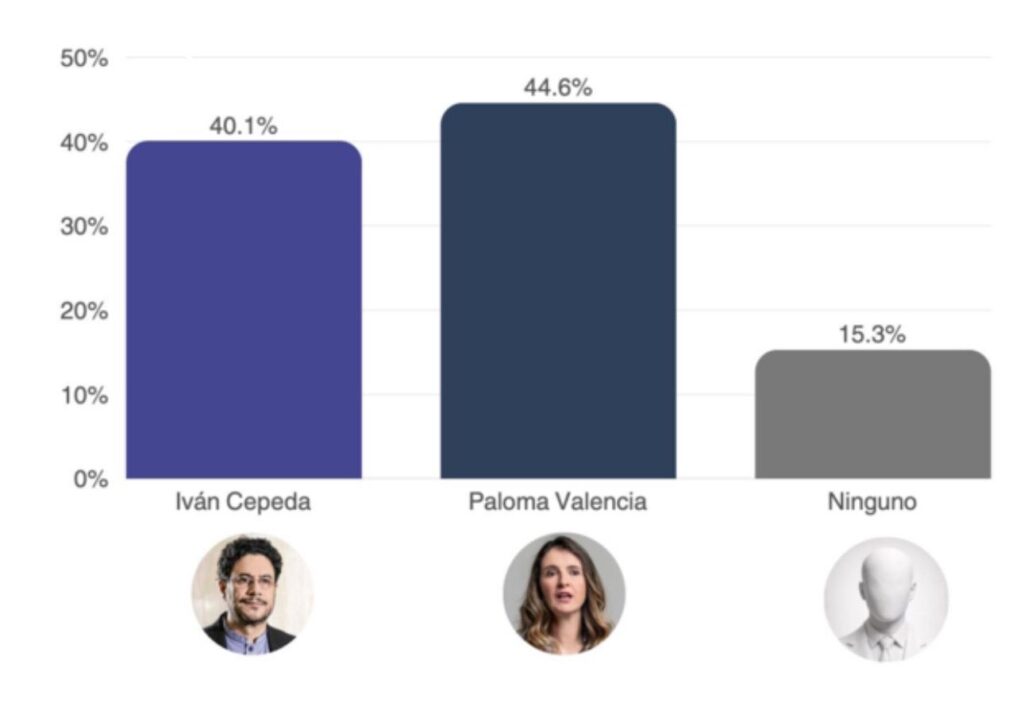 Según la rigurosa encuesta de Guarumo, una de las más exigentes y precisas hasta el momento, en un escenario de segunda vuelta Paloma Valencia obtendría el 44.6% de los votos frente al 40.1% de Cepeda. La medición también muestra que Cepeda y Abelardo han alcanzado su techo electoral, es decir difícilmente crecen más mientras Paloma es la única candidata que mantiene una tendencia de crecimiento.