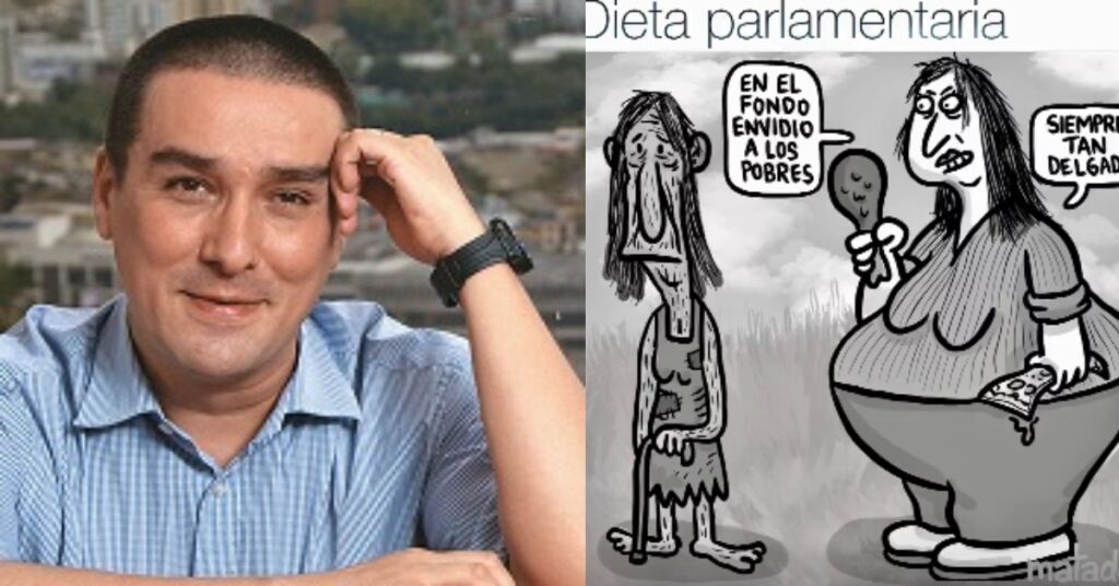 Finalmente, el caricaturista señaló que su crítica se centra en decisiones políticas y recordó una frase del fallecido humorista Jaime Garzón, según la cual “los políticos no se dirigen al país, sino que se digieren al país”. En ese contexto, sostuvo: “Entonces mi crítica política es a eso, a la glotonería del poder porque ella niega $230.000 a los ancianos más pobres del país, pero se muestra en sus redes comiendo. Por eso la caricatura se titula ‘Dieta parlamentaria’”.