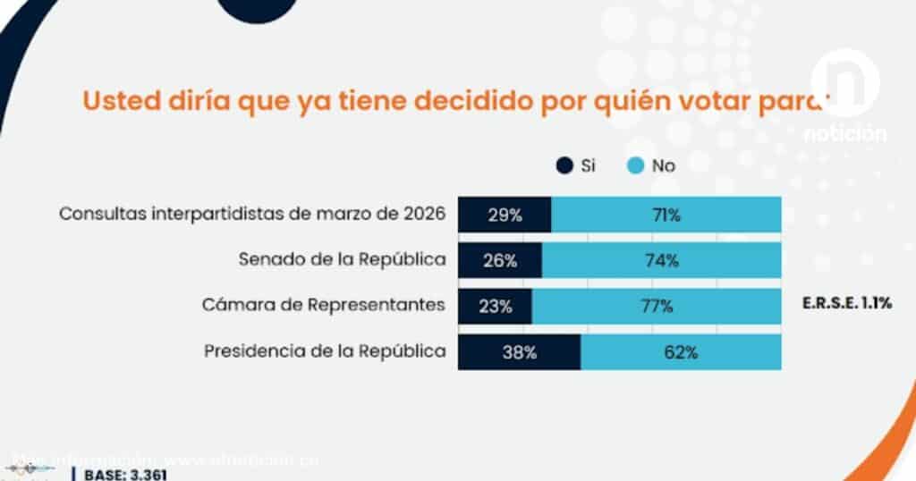 El estudio muestra que la mayoría de los colombianos aún no ha decidido su voto: el 62% de los encuestados no tiene preferencia definida para la Presidencia. Esta tendencia se repite en las consultas interpartidistas (71%), al Senado (74%) y a la Cámara de Representantes (77%), reflejando un escenario de fuerte indecisión.