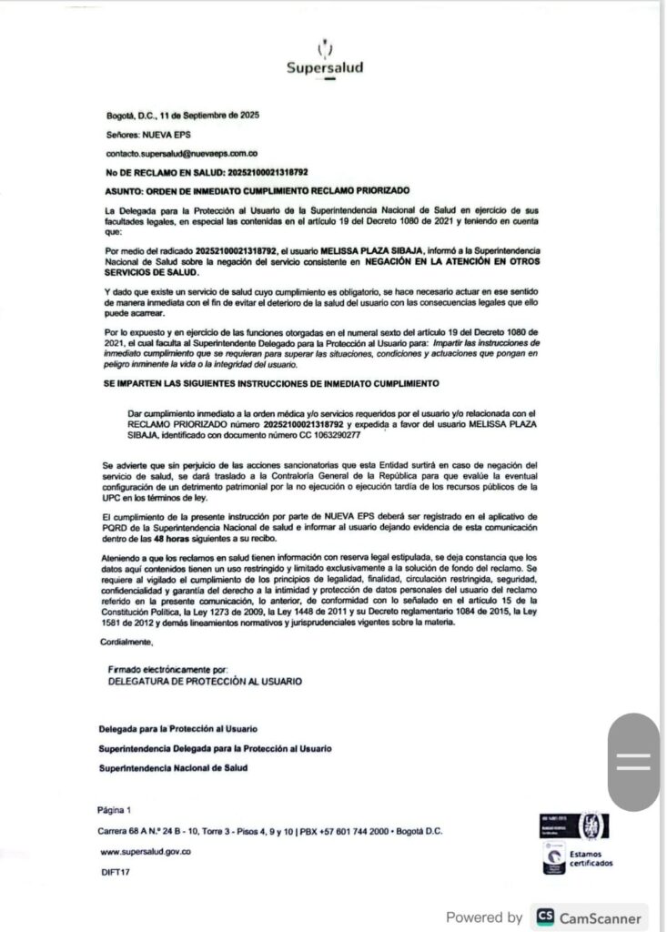 Melissa ha interpuesto denuncias ante la Fiscalía, la Procuraduría y la Superintendencia de Salud, esta última priorizó el caso, pero no ha habido avances concretos. “Se están burlando de mí. Tengo una tutela ganada, pero no respetan ni la ley ni mi salud”, afirma con indignación.