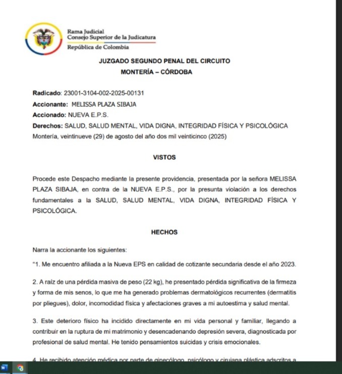 Melissa, quien ha sido paciente de psicología durante tres años por problemas derivados de obesidad severa, logró perder 22 kilos, lo que le ocasionó una atrofia mamaria que requiere intervención quirúrgica. Desde diciembre de 2024 tiene la orden médica para realizarse una mastopexia y mamoplastia de aumento con dispositivo, pero la EPS no ha autorizado el procedimiento, alegando falta de contratación con la Clínica Montería, donde debía ser atendida.
