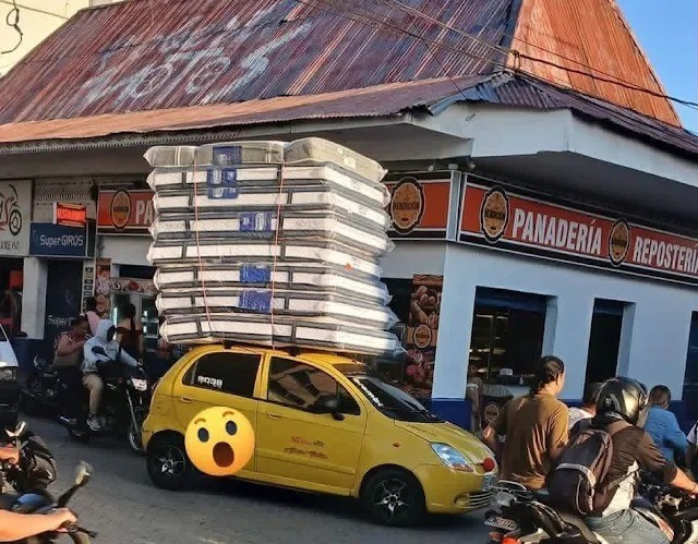 El inusual episodio ocurrió frente a la reconocida panadería La Bendición, donde el conductor fue visto transportando ocho colchones perfectamente apilados sobre el techo del taxi, desafiando la gravedad, la aerodinámica y la imaginación de los transeúntes.