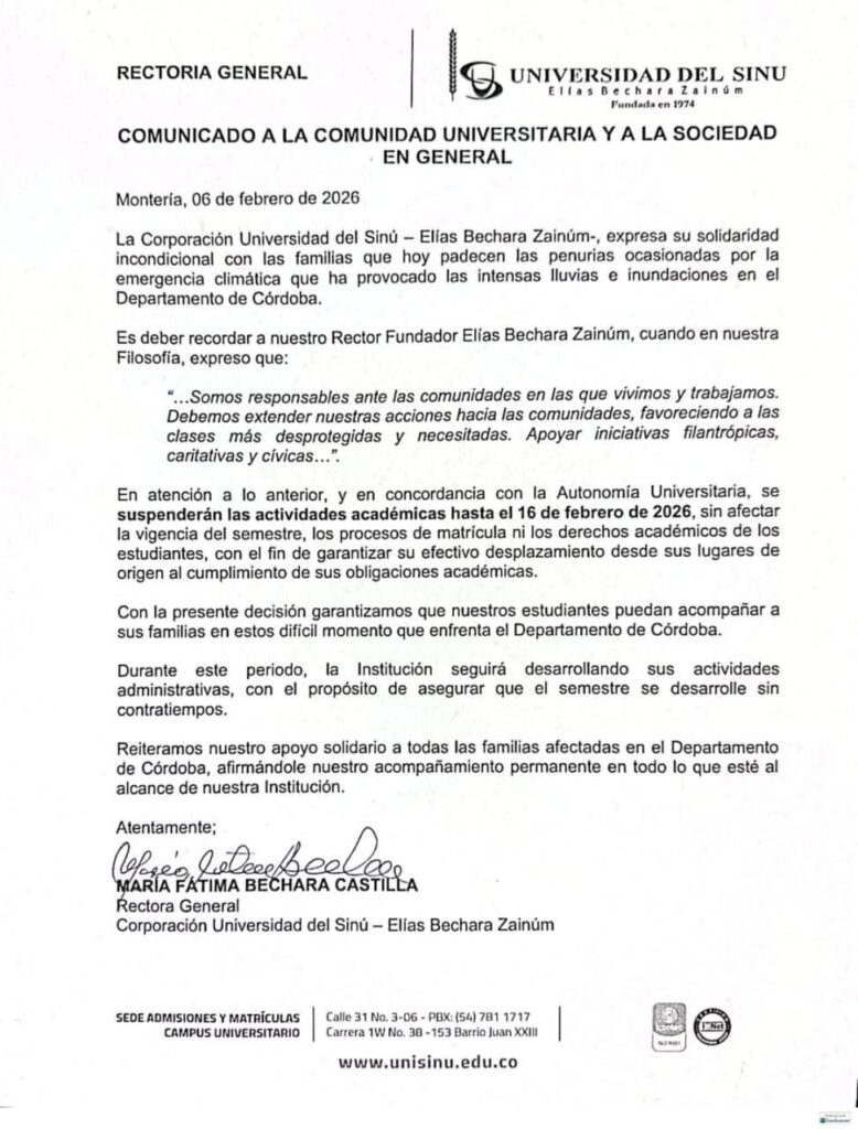 La Universidad del Sinú (Unisinú) anunció la suspensión inmediata de todas sus actividades académicas como medida preventiva frente a la emergencia climática que atraviesa el departamento de Córdoba.