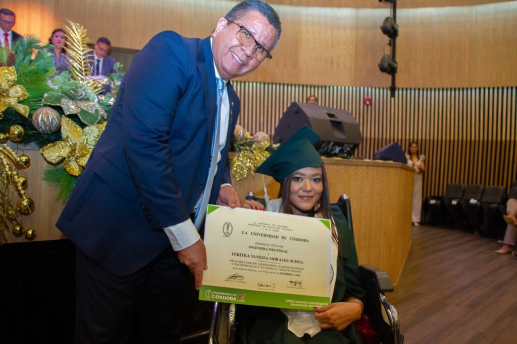 Montería, 19 diciembre de 2025. Con el título de Ingeniera Industrial en sus manos, Yeritka Vanessa Morales Ochoa cerró una etapa iniciada en 2019 y abrió otra llena de proyectos profesionales. En el Auditorio Cultural de la Universidad de Córdoba, acompañada por sus padres, recibió el diploma de manos del rector Jairo Miguel Torres Oviedo, en una ceremonia que simbolizó la culminación de años de constancia, respaldo familiar y acompañamiento de amigos.